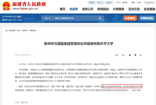 2021年10月31日,泉州市人民政府与源昌集团在南安举行共建泉州高水平大学框架协议签约