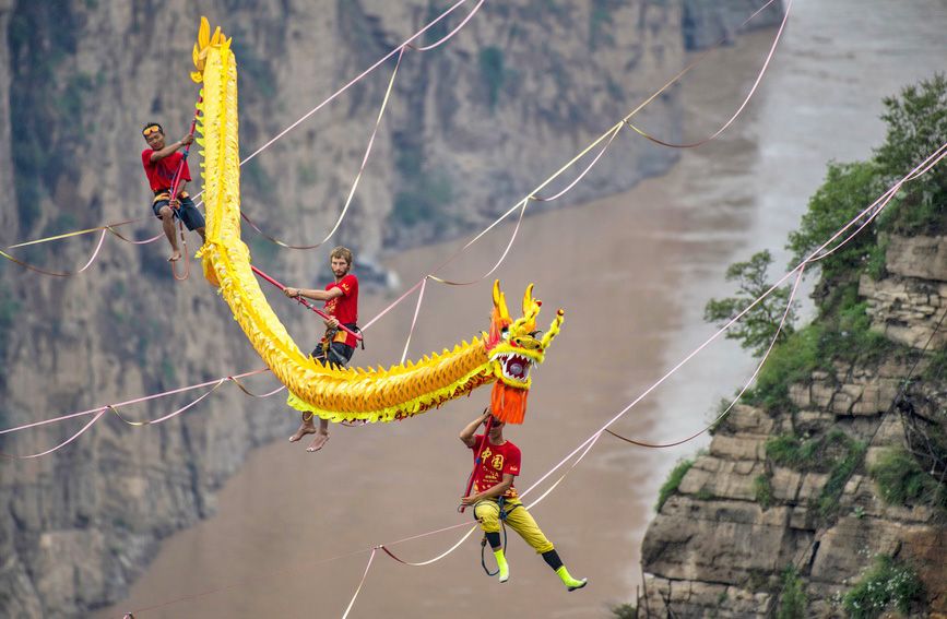 9月13日至16日,黄河大梯子崖高空扁带国际挑战赛暨高空舞龙表演在山西河津举行。经过激烈角逐,中国选手何锦毅获得百米竞速赛冠军。薛俊摄(人民图片网)