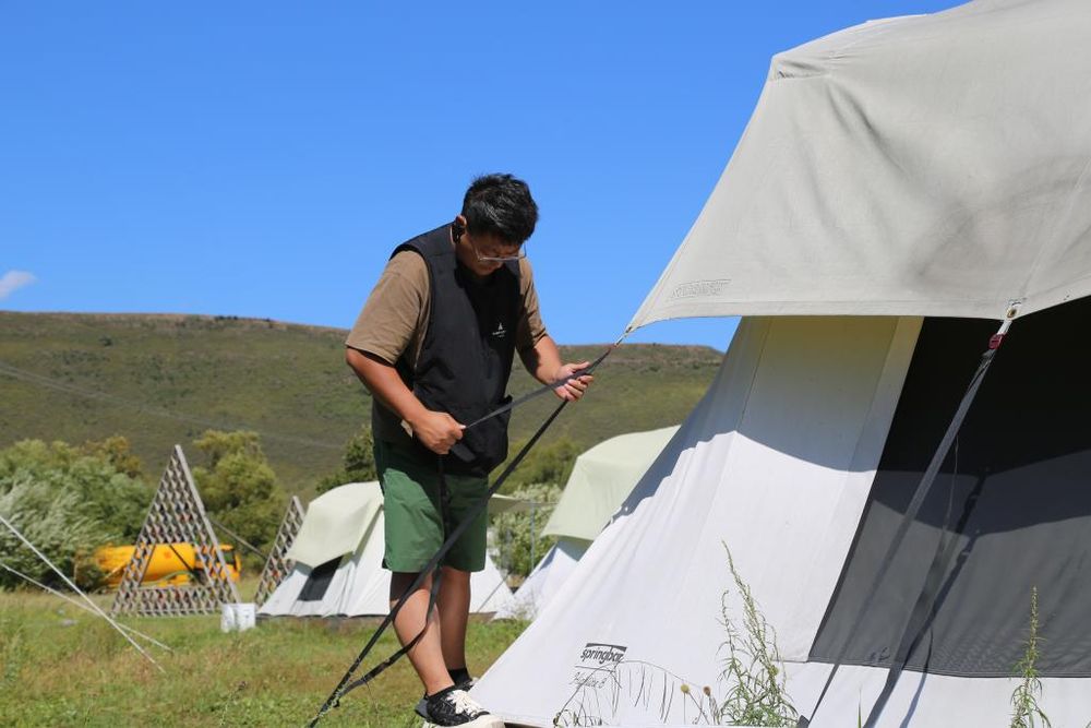 李双正在给帐篷紧绳子。新华社发(王钰 摄)