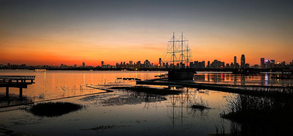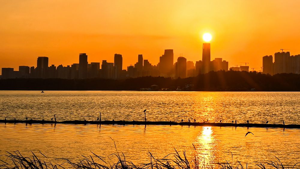 10月22日,湖北省武汉市的东湖风景区在夕阳和晚霞的映衬下,壮美如画。新华社记者 沈虹冰 摄