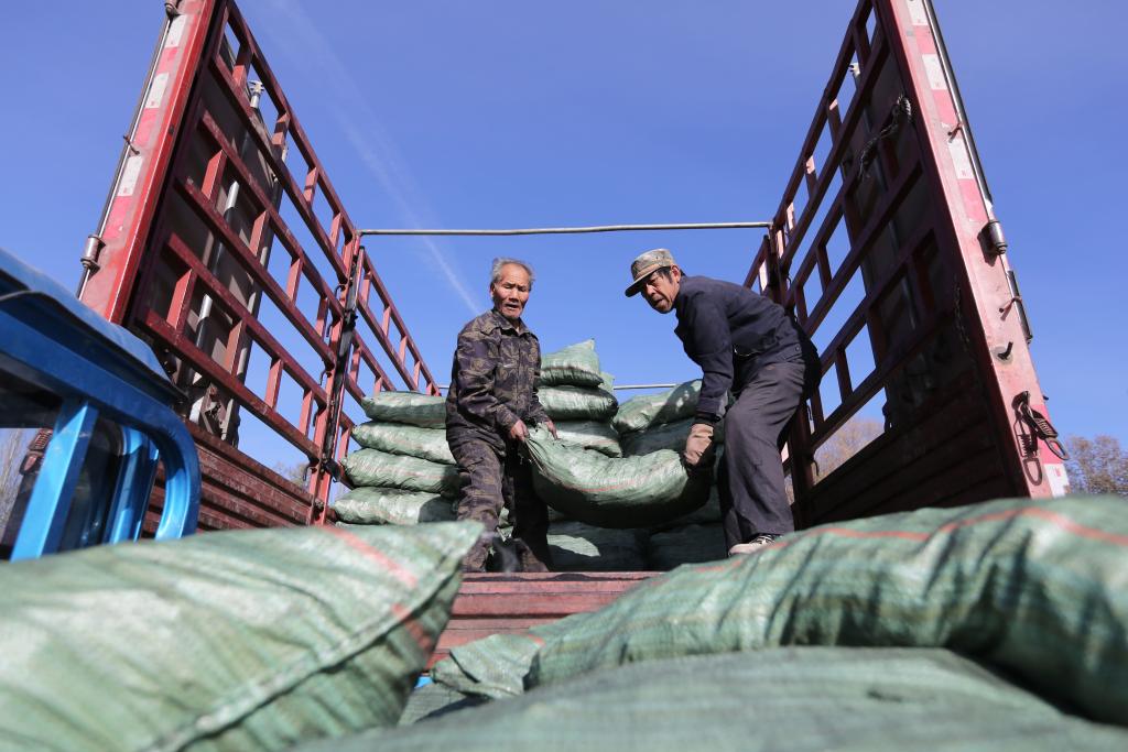 11月19日,甘肃省定西市安定区内官营镇先锋村村民在搬运政府发放的取暖用煤。