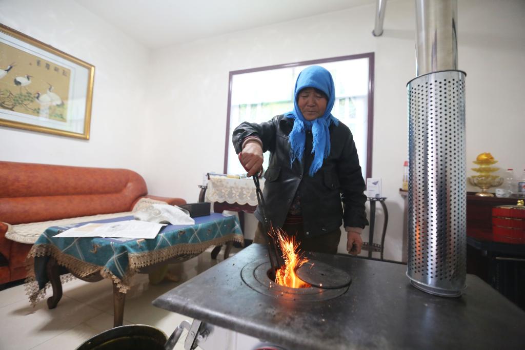 11月18日,在甘肃省定西市安定区凤翔镇中川村,刚领到新煤炉和取暖用煤的村民生火取暖。