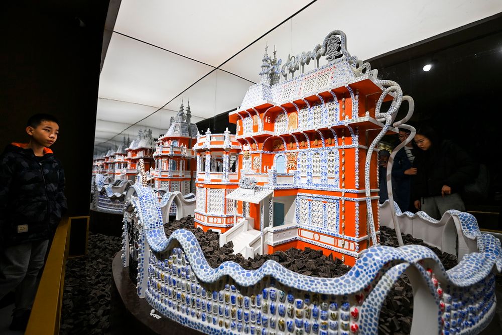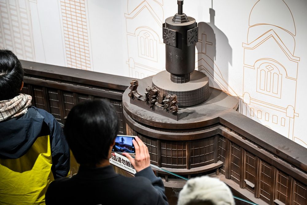 巧克力雕塑作品中既有“天津之眼”摩天轮、天津站等城市地标,又有哪吒闹海等故事场景,吸引众多游客参观打卡。新华社记者 赵子硕 摄