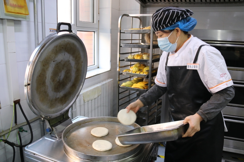 在位于宁夏吴忠市的秦宁中学,“妈妈后厨”丁小梅正在制作面点。(受访者供图)