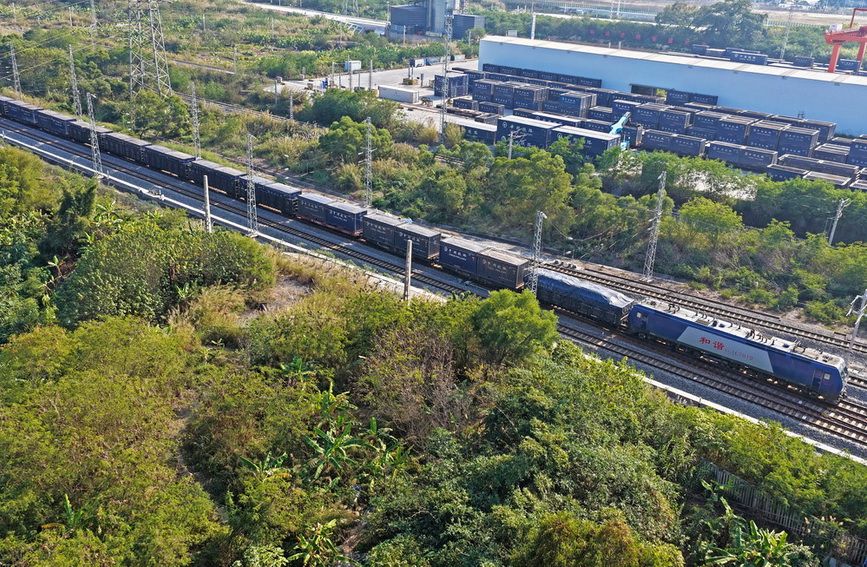 2026年1月8日,一列装运集装箱的列车驶出南宁国际铁路港(无人机照片)。