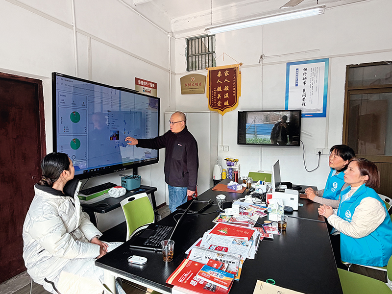 谢文轶(左二)与四团阿姨志愿者在使用微牵挂系统查看区域内老年人的登记信息(2025 年 12 月 17 日摄) 袁全摄 / 本刊