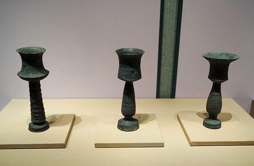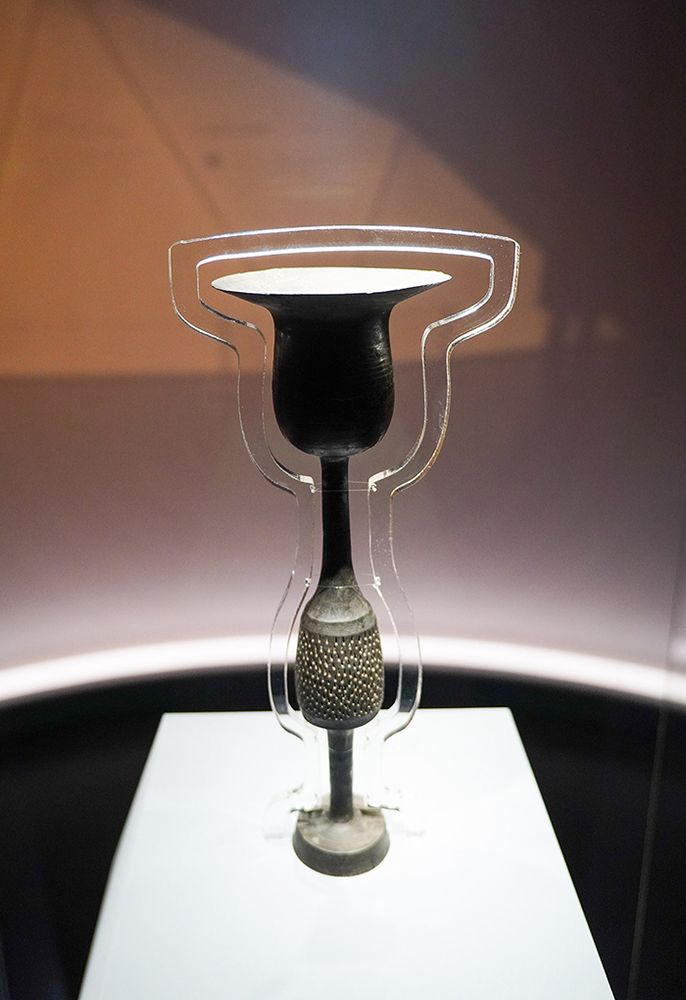 这是1月27日在山东博物馆“对话蛋壳黑陶高柄杯”明星文物展上拍摄的大汶口文化黑陶高柄杯。新华社记者 徐速绘 摄