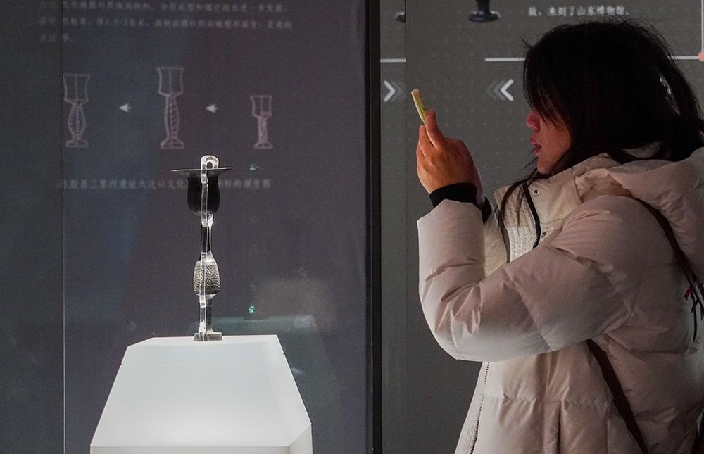 1月27日,在山东博物馆“对话蛋壳黑陶高柄杯”明星文物展上,一名参观者观看龙山文化蛋壳黑陶高柄杯。新华社记者 徐速绘 摄