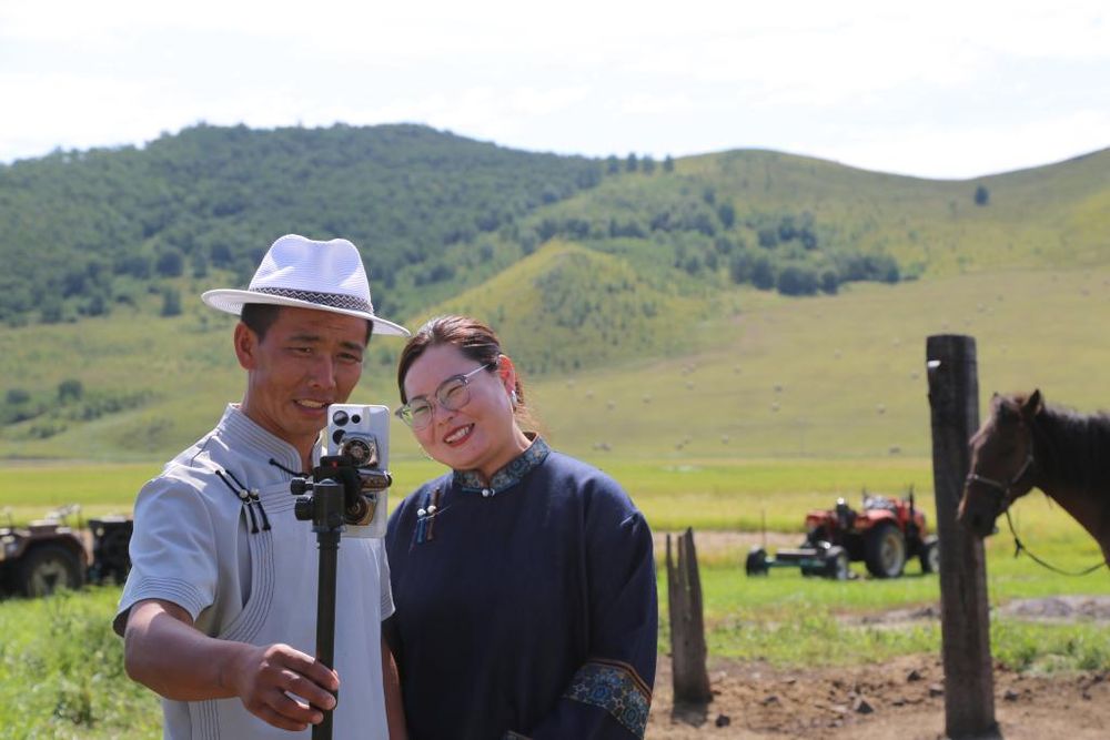 牧民春喜和他的妻子正通过直播展示自家草场风景。新华社发(王钰 摄)