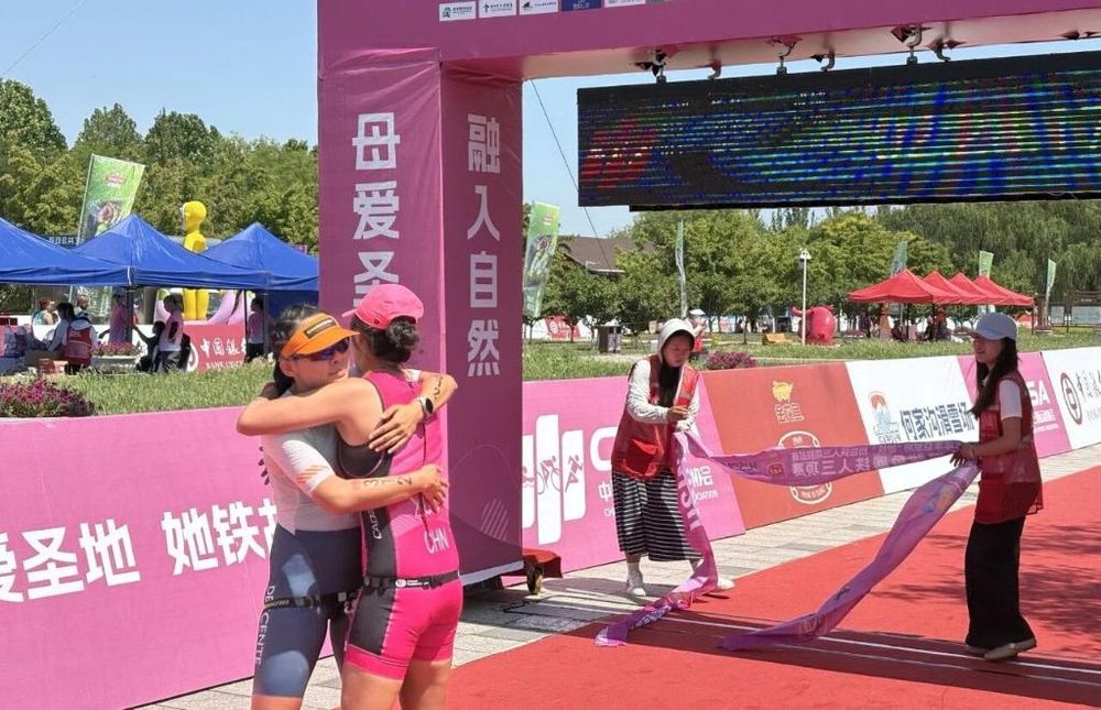 除了在赛场上的比拼,令人动容的还有“她铁”选手们相互鼓励、加油的场面。首站比赛里,刘芊箬体力不支,在心率170、“跑吐两次”之后,开始放慢比赛节奏,在跑步阶段跑错路后,经过同年龄组对手的徐莹善意提醒,两人一同跑向终点、相拥庆祝,最终净成绩用时更短的徐莹取得全程组全场第一名,刘芊箬收获第二名。
