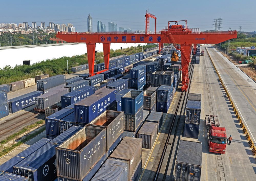 2026年1月8日,一列装运集装箱的列车驶出南宁国际铁路港(无人机照片)。