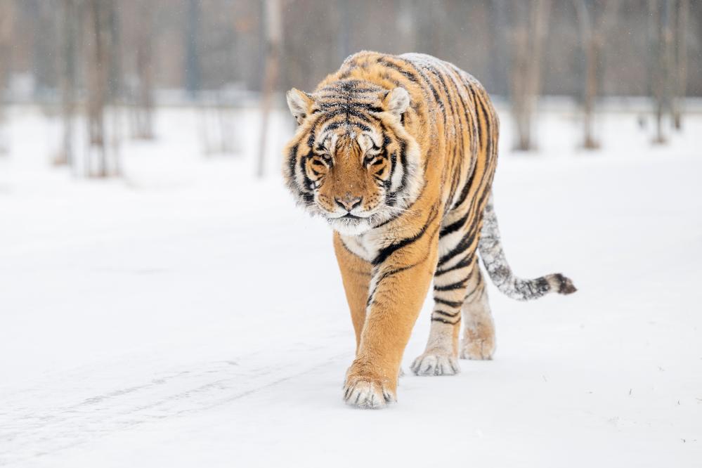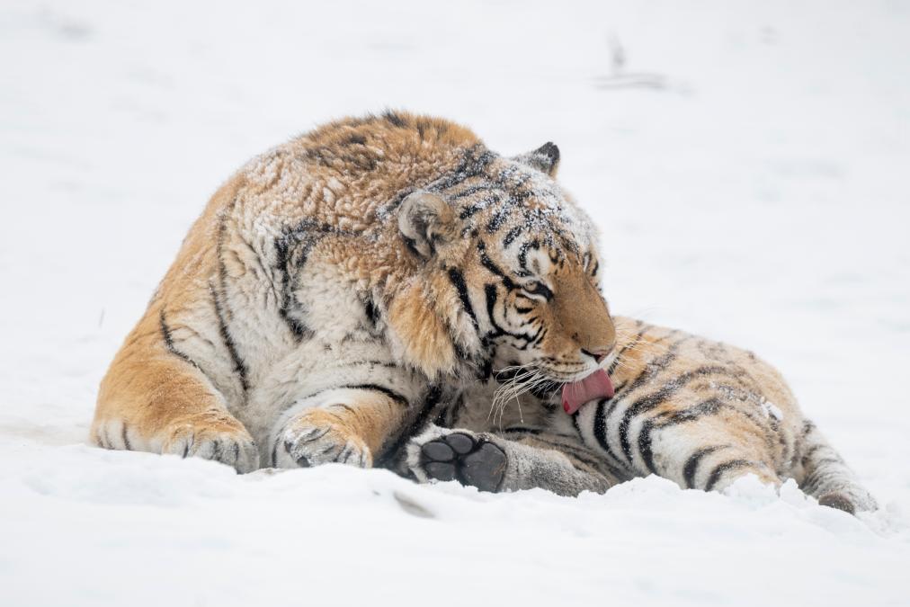 1月12日,冰城哈尔滨市迎来降雪天气,在黑龙江东北虎林园,散放区的东北虎在雪地活动。