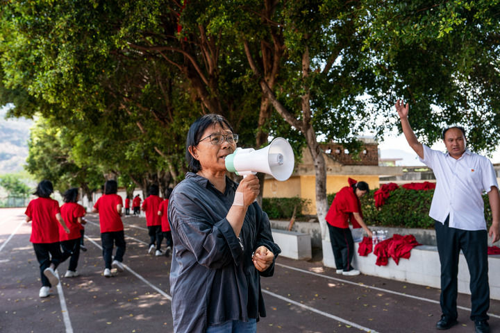 置身这一令人肃然起敬的氛围中,我看到华坪女高党支部书记、校长张桂梅,一步步艰难地走过一级级台阶,拿着一支当下并不多见的“小喇叭”向同学们喊话。然而,这些年张桂梅老师喊话最多的,要数对这些女孩的父母了——让你们的女儿来读书吧,一切我都管!